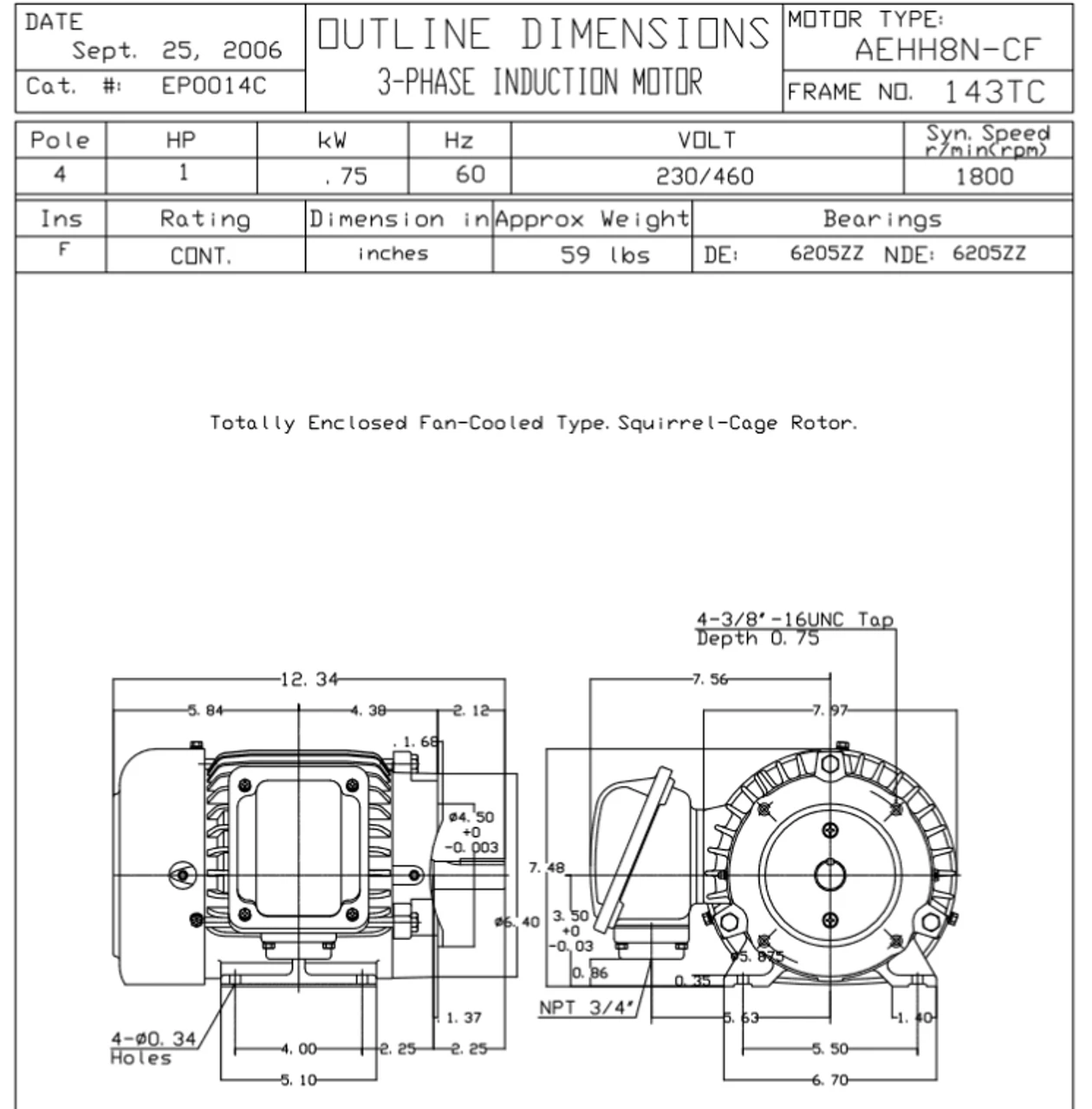 - NEMA 143TC Frame, 2 1/4 x 7/8″ Dia. Keyed Shaft