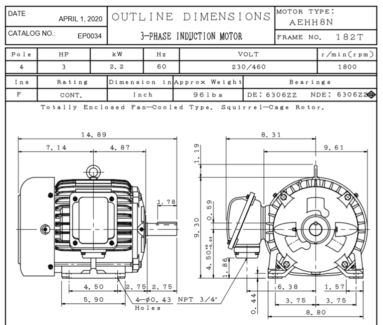 - NEMA 182/184T Frame, 2 3/4 x 1 1/8″ Dia. Keyed Shaft