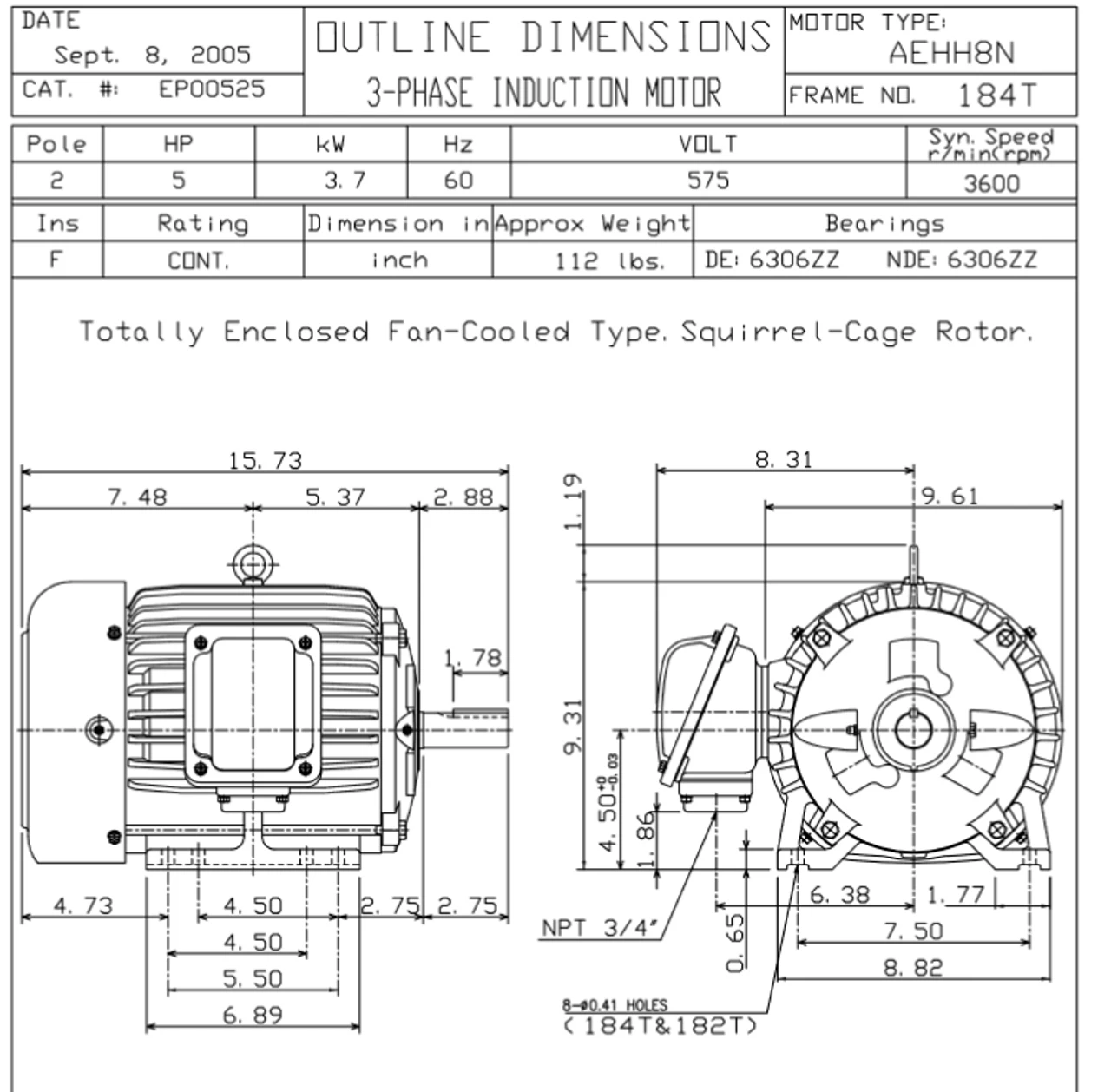 - 5 hp 3600 RPM, 4.58 amps 575 Volts 60Hz. Three Phase