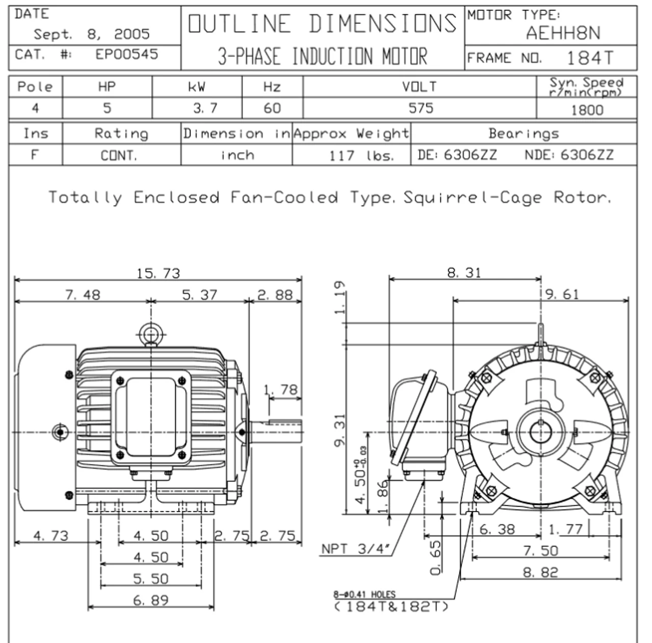 - NEMA 182/184T Frame, 2 3/4 x 1 1/8″ Dia. Keyed Shaft