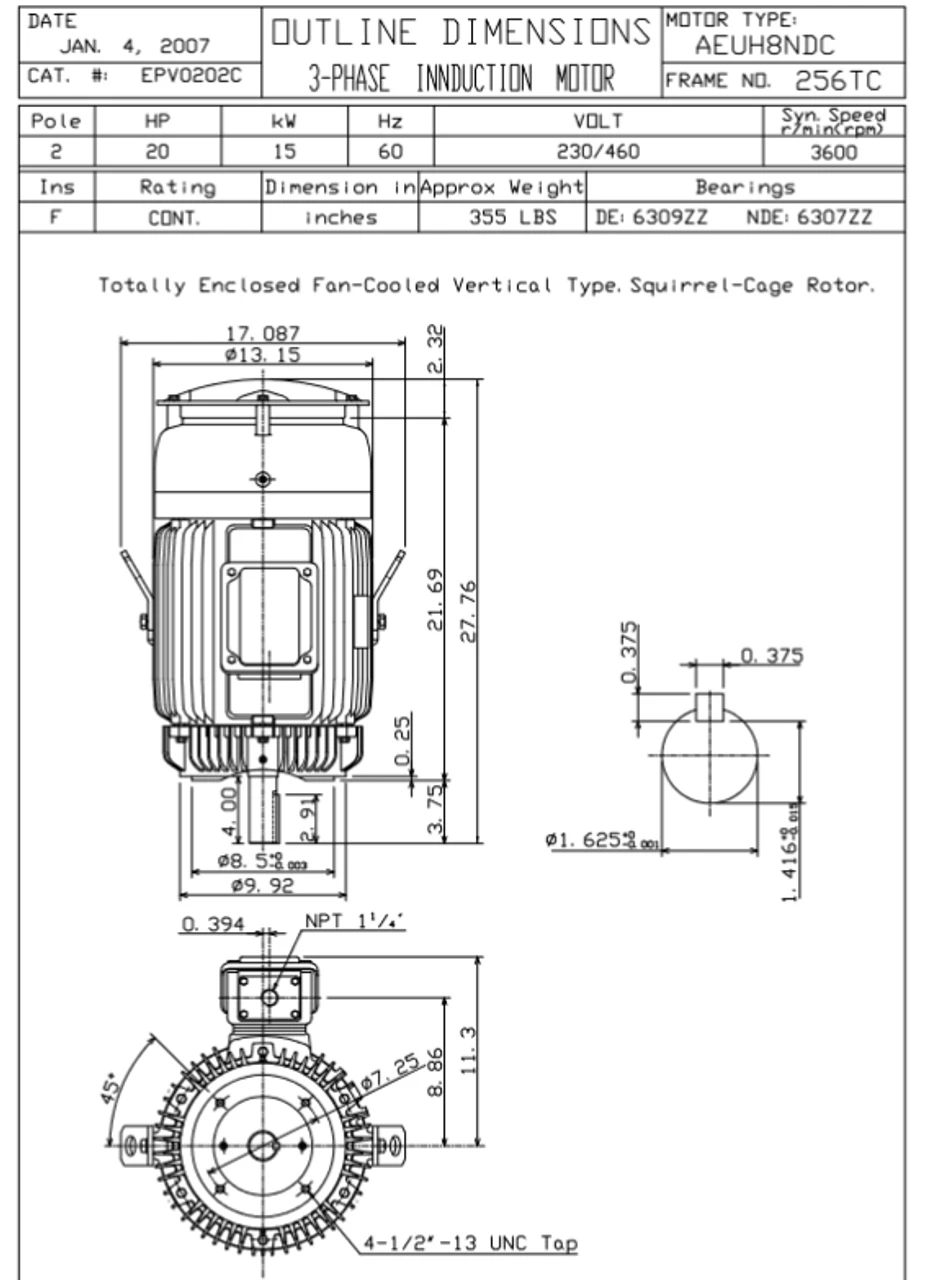- NEMA 256TC Frame, 3 3/4 x 1 5/8″ Dia. Keyed Shaft