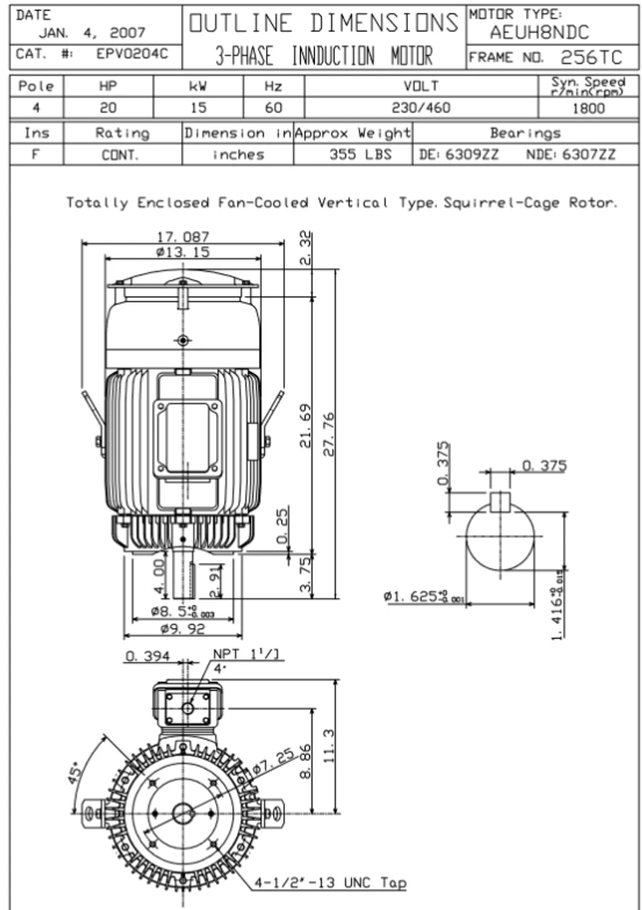 - NEMA 256TC Frame, 3 3/4 x 1 5/8″ Dia. Keyed Shaft
