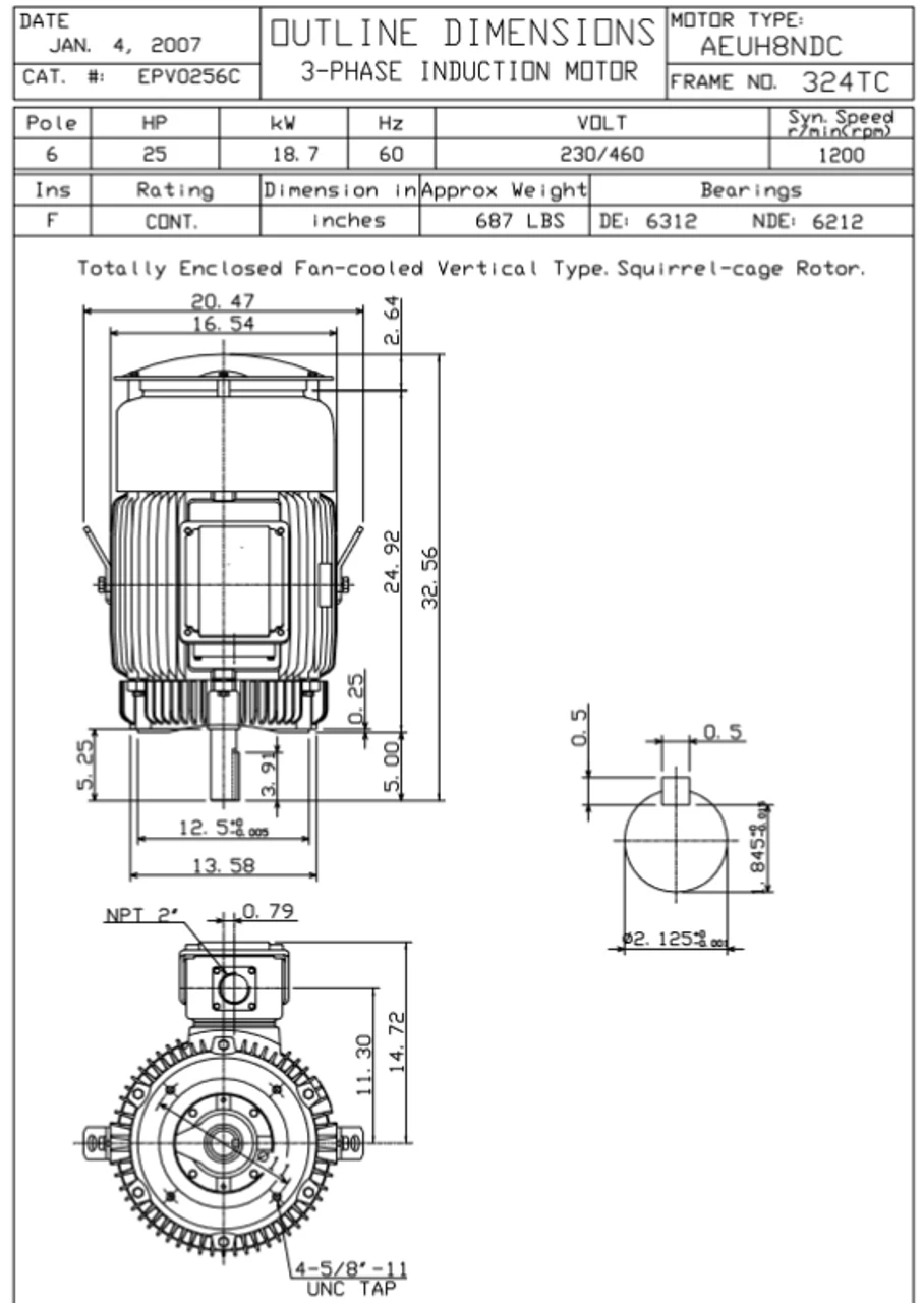- NEMA 324TC Frame, 5 x 2 1/8″ Dia. Keyed Shaft
