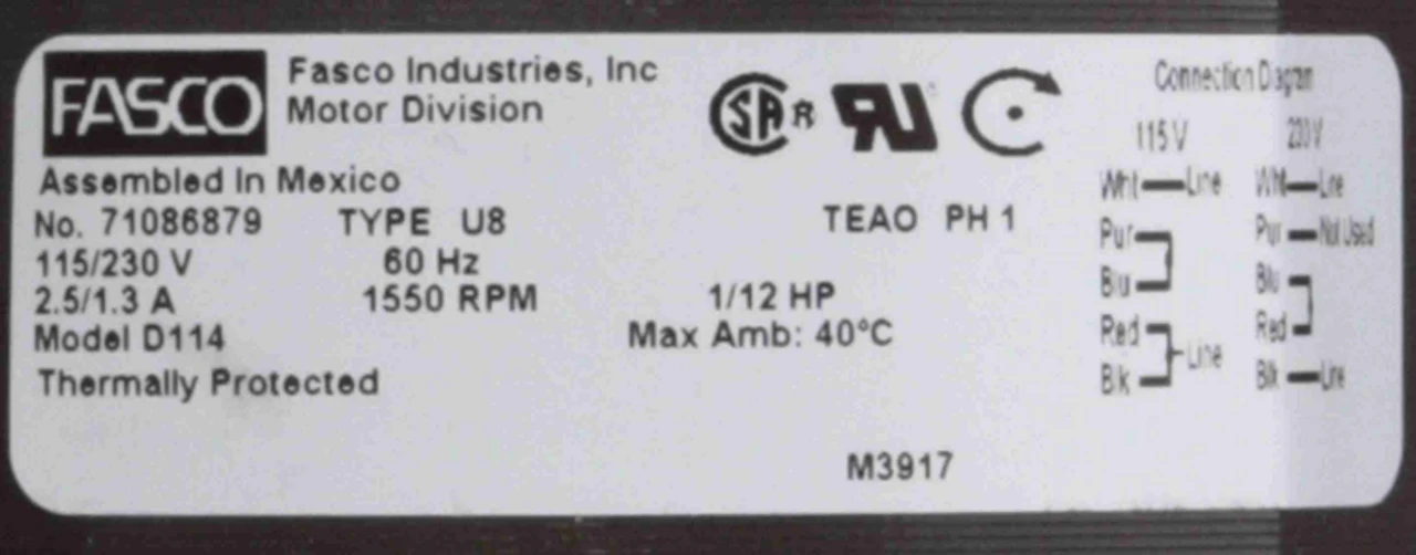 - 1/12 hp 1550 RPM, 2.5/1.3 amps, 115/230 Volts 60hz.