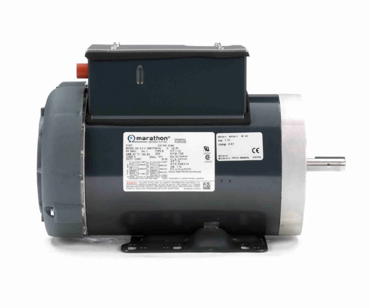 General purpose motor can be used for many applications requiring a single phase electric motor with a C-face mount. Motor has 4 threaded bolt holes on face for mounting a pump or gear-box. Bolt holes are 5 7/8″ on center measured across the shaft. Wiring diagram on motor name plate. TEFC = Totally Enclosed Fan Cooled. 056B17F5310
