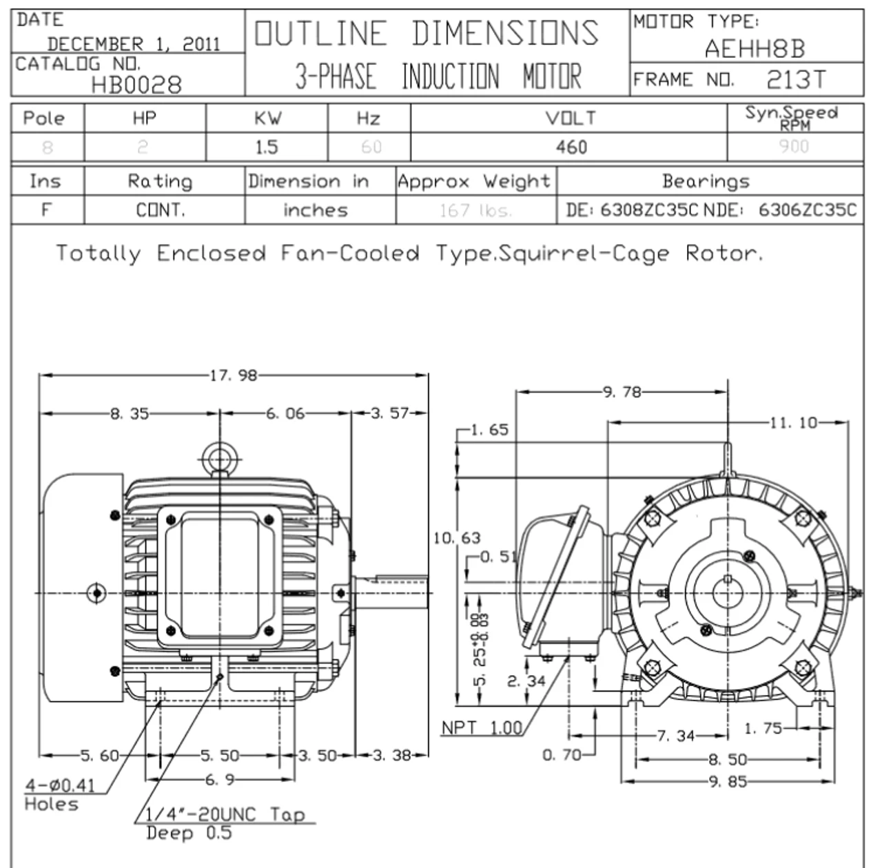- NEMA 213T Frame, 3 3/8 x 1 3/8″ Dia. Keyed Shaft