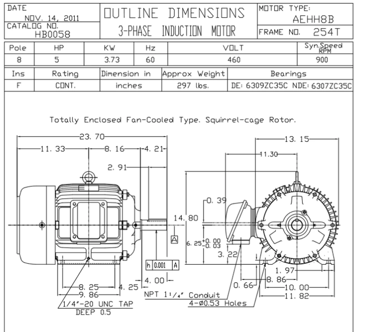 - NEMA 254T Frame, 4 x 1 5/8″ Dia. Keyed Shaft