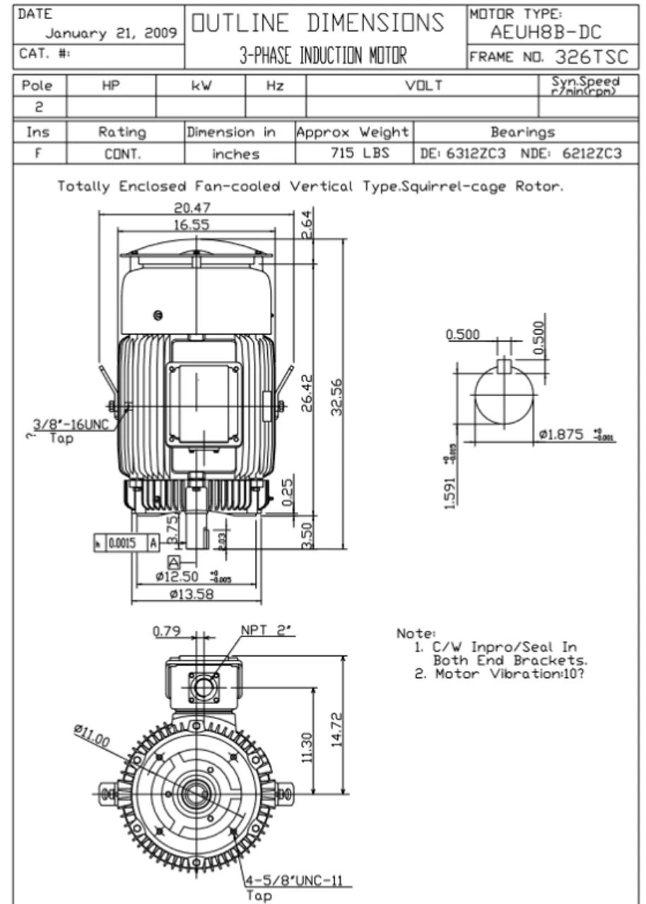 - NEMA 326TSC Frame, 3 1/2 x 1 7/8″ Dia. Keyed Shaft