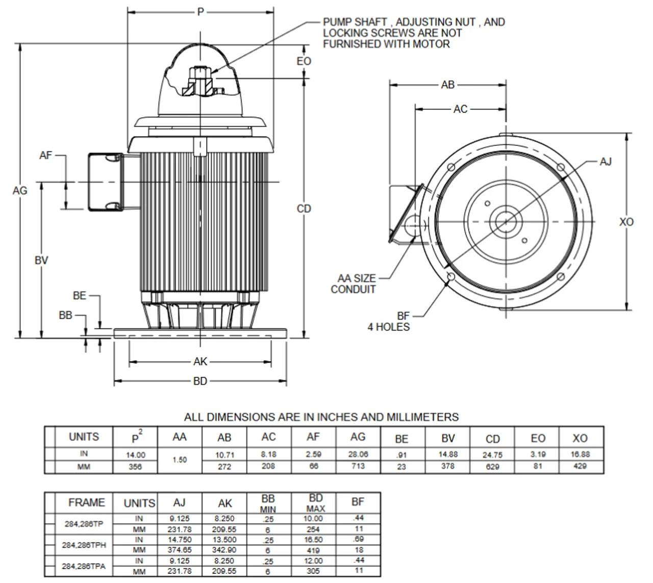 - NEMA 286TPH Frame, AUSI type, 16.5″ Dia. Base