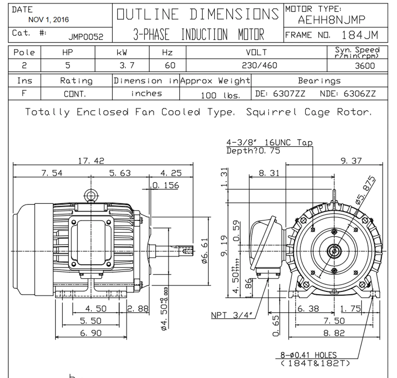 - 5 hp 3600 RPM, 11.4/5.72 amps 230/460 Volts 60hz. Three Phase