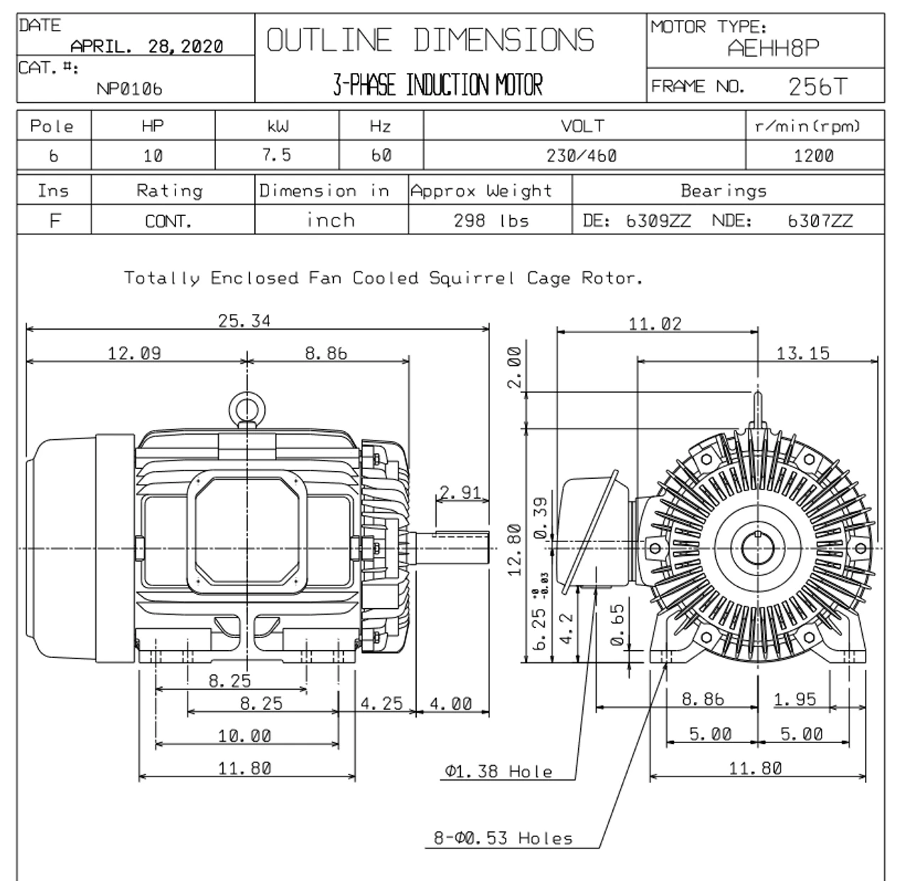 - 10 hp 1200 RPM, 25.6/12.8 amps 230/460 Volts 60hz. Three Phase