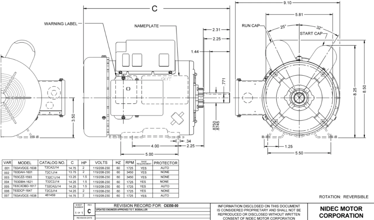 - NEMA 145T Frame, Rolled Steel with Cast Aluminum End Bells, Keyed Shaft 7/8″ Diameter x 2 1/4″