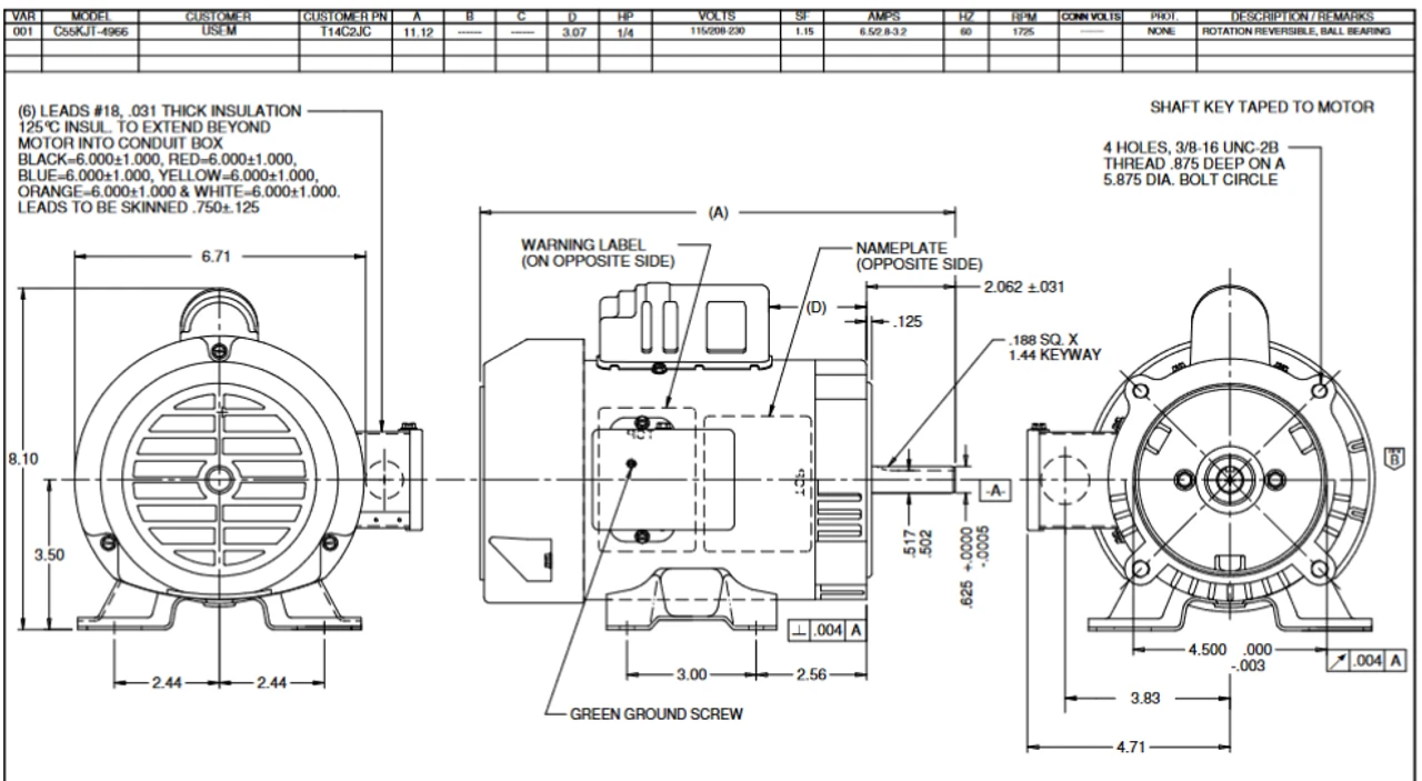 General purpose C-Face motor for pumps, conveyors, air compressors, and blowers. Wiring diagram on motor name plate. TEFC = Totally Enclosed Fan Cooled. T063CZY1592015B