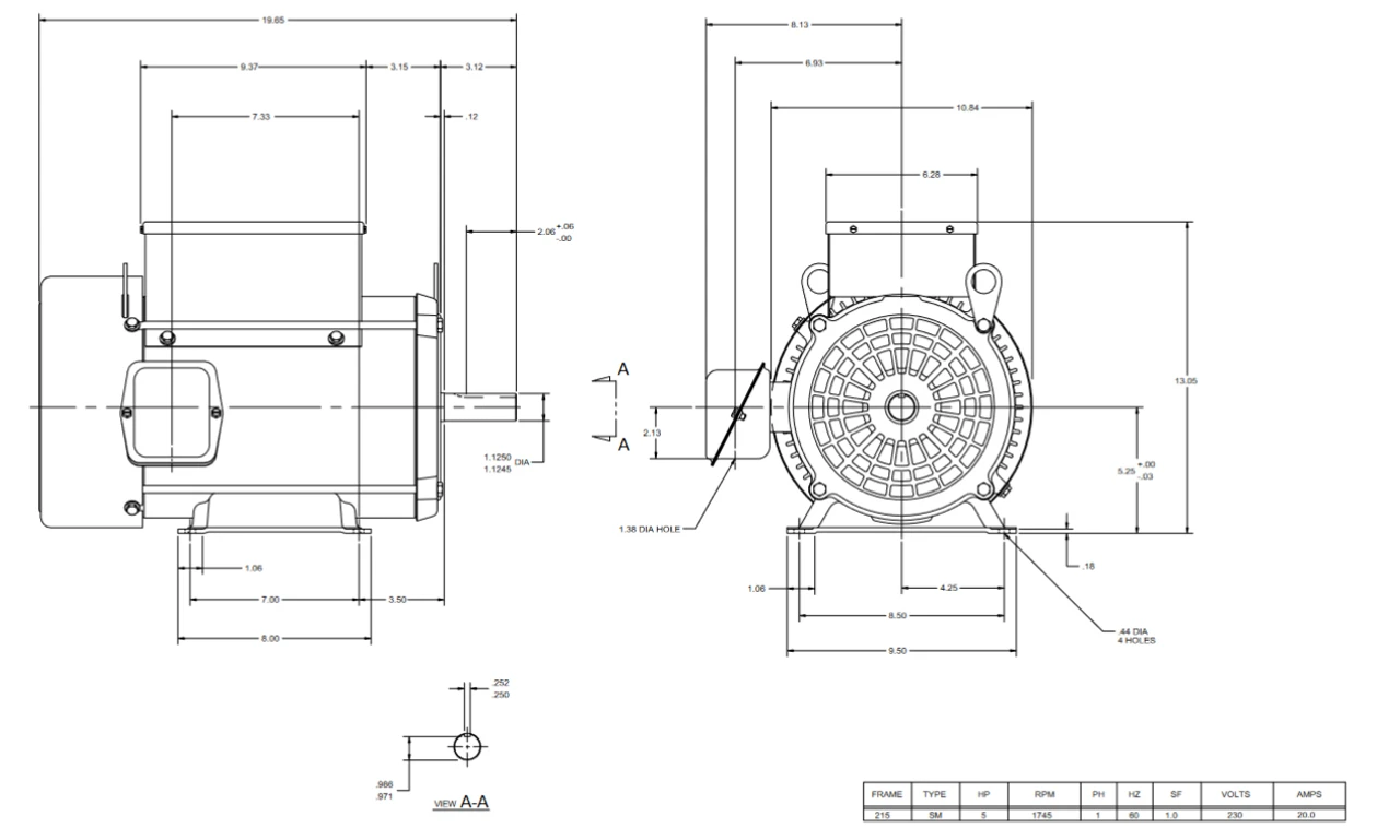 - NEMA 215 Frame, Rolled Steel with Cast Aluminum End Bells, Keyed Shaft 5/8″ Diameter x 1 7/8″