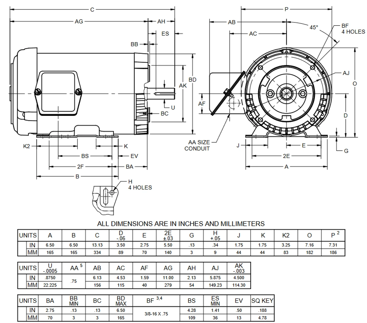- NEMA 145TC frame Keyed Shaft 7/8″ Diameter x 2 1/4″