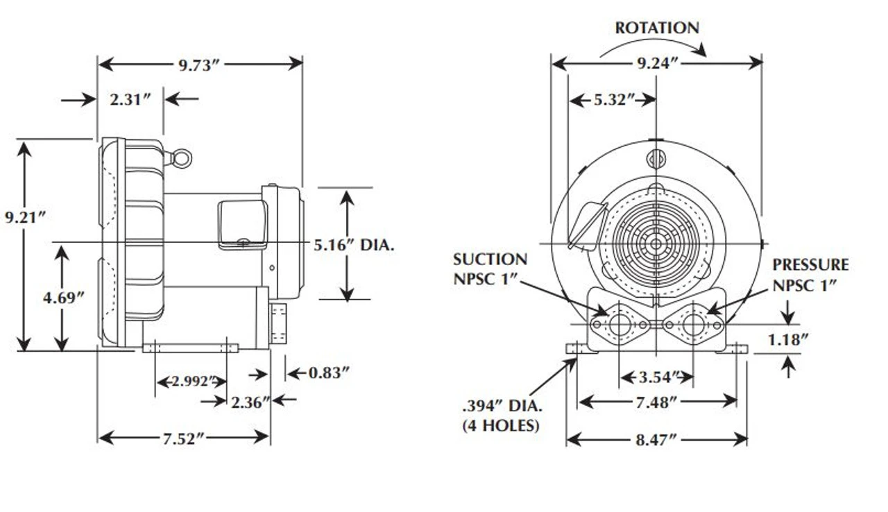 Designed for expanded flow and pressure, these industrial-duty, oilless air blowers can be used for pressure or vacuum. They provide air flow without pulsation, operate at low noise levels, and are dynamically balanced to eliminate vibration. Feature dustproof shaft seal and Class B NEMA insulation. Equipped with continuous duty TEFC motors that are built as a single unit no gears, belts, motor bushings, or sliding valves. Aluminum alloy impeller, mounting base, and housing (Nos. VFC700A-7W, VFC804A-7W, and VFC904A-7W have cast-iron housing). Uses: For original equipment or upgraded performance. Pneumatic air tube conveying systems, vacuum cleaning systems, vacuum lifting, vacuum hold down, vacuum transport, bottle filling stations, printing presses, screen printing, air cushion tables, drying systems, weld fume extraction, textile machinery, dental equipment, waste and water fish pond aeration, aquarium aeration, aeration plating tanks, and air knife systems. Dayton Reference 4Z750.