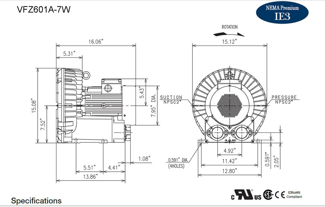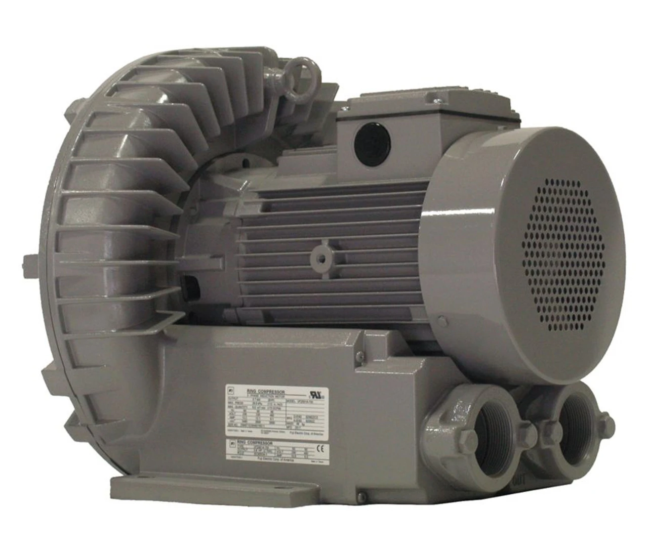 The VFZ Series are single-stage ring compressors with a maximum pressure of 139 in. H2O, a maximum vacuum of 110 in. H2O and a maximum capacity of 570 SCFM. Motors are direct drive from 1 HP to 15 HP. Voltages are available in 115 single phase, 230 single phase, 230/460 3-phase dependent upon motor size. All units are provided with threaded flanges.