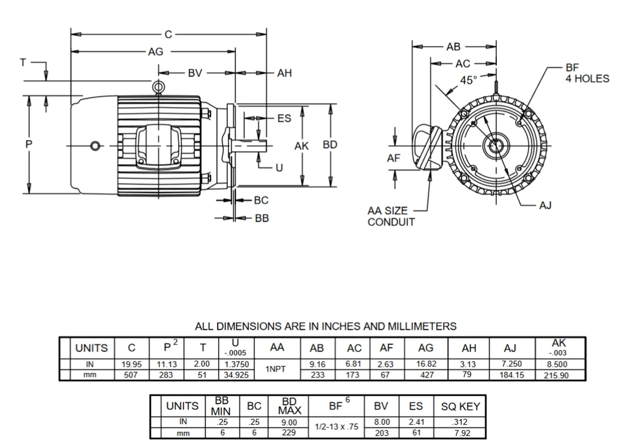 - NEMA 215TC Cast Iron Frame, Keyed Shaft 1 3/8″ Diameter x 3 3/8″