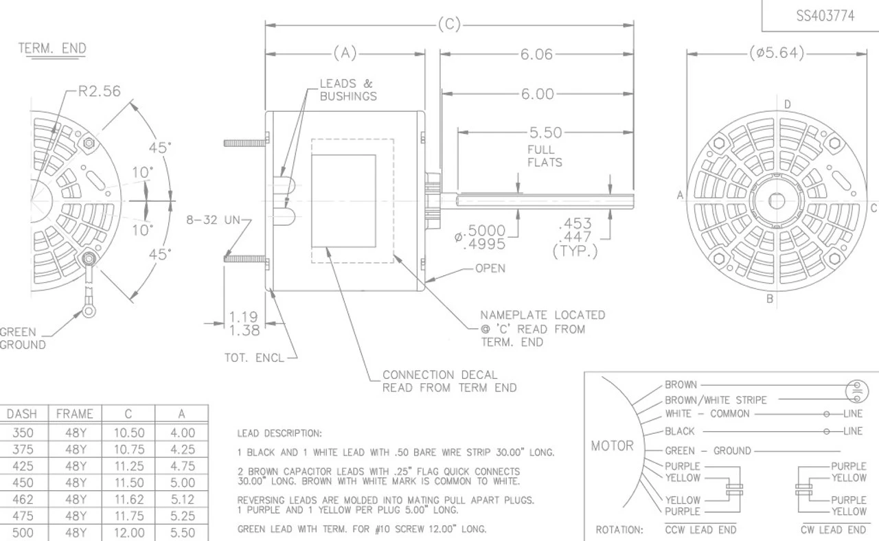 - 1/3 hp 1075 RPM, 2.0 amps, 208-230 Volts 60 Hz, Permanent Split Capacitor (PSC)