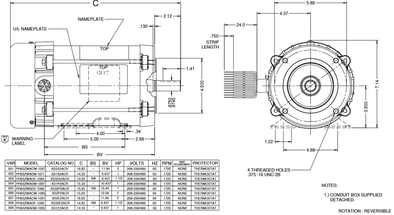 General purpose Division 1 hazardous location motor for class 1 group CD, class 2 group EFG. Wiring diagram on motor name plate. TEFC = Totally Enclosed Fan Cooled. PH63ACW1085015B