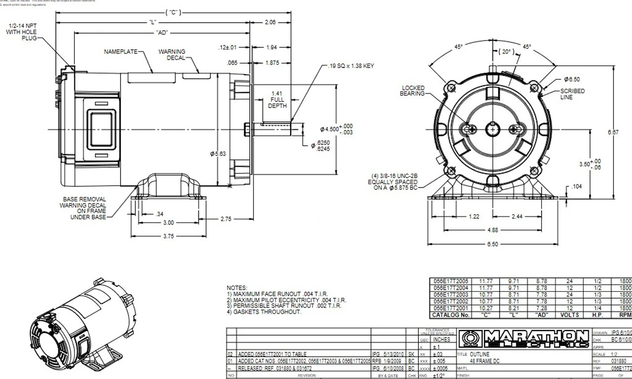 Battery voltage DC electric motor with a C-face mount. Shaft has keyway. Wiring diagram on motor name plate. TENV = Totally Enclosed Non-Ventilated. 056E17T2001