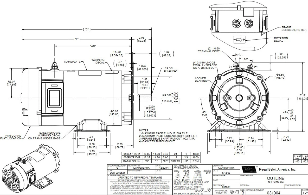 Battery voltage DC electric motor with a C-face mount. Shaft has keyway. Wiring diagram on motor name plate. TEFC = Totally Enclosed Fan-Cooled. 056E17F2008